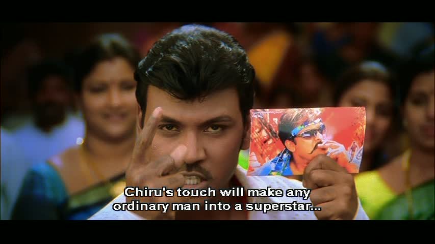 Raghava, rather endearingly and totally understandably, is obsessed with Chiranjeevi. The presence of Megastar Chiru, real or imagined, sparks some of the best and funniest scenes in the film, including a fight sequence worthy of Jackie Chan.