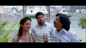 Arya is surprisingly good as Baskaran. Having seen him in more serious roles in Varudu and Madrasipattinam I wasn’t sure how he would deal with a much more light-hearted character but he manages to impress. His facial expressions are more animated than I remember from previous films, his comedic timing is mostly good, and overall he strikes the right balance between ineptitude and stupidity for his character. Nayantara on the other hand is a bit of a disappointment. I expected more from her after her performance in Yarada Nee Mohini, but she seems very lifeless and there is no chemistry between her and Arya. Some of this may be due to the rather one-dimensional characterisation of Chandrika who just seems to be there as the love interest and nothing else.