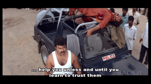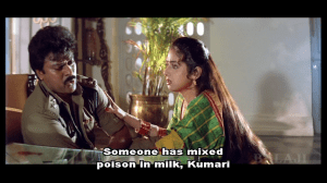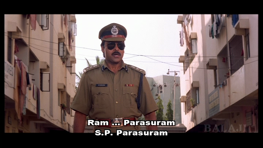 There are double crosses and betrayals all over the place, and a hefty dollop of tension as characters come so close to their doom and yet don’t quite succumb. A corrupt subordinate with a grudge (Devaraj as the sleazy Rayappa) gains advancement and Ram has to put duty ahead of personal desire. His trials don’t end there, but our hero is indomitable, using his precise manners as a weapon. Chiru almost draws blood just with the word ‘Sir’. Circumstances are manipulated to humiliate and undermine him but Parasuram never falters in his dedication although his temper is put to the test. There is some joy in his life as his marriage to Kumari is clearly happy and loving. But joy can be turned to pain and of course the baddies have another shot at eliminating the one witness that could potentially destroy them.