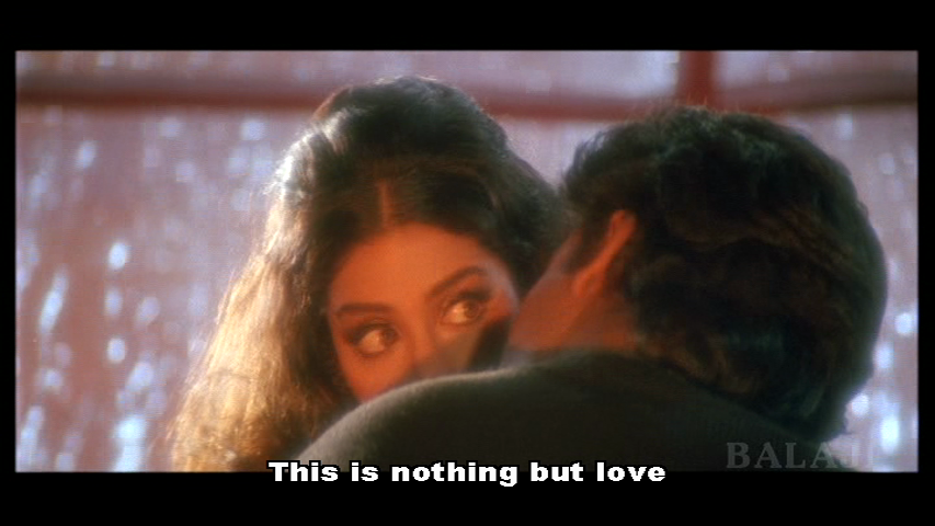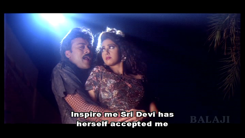 I love this song mostly because I get to see Chiru wearing a Koala print jumper. Maybe he was thinking about his Australian fan base or maybe it’s all the wardrobe guy could find.  The ankle boots, black socks and high baggy pants are not so pleasing, but it was the 90s…And Sri Devi didn’t fare any better.