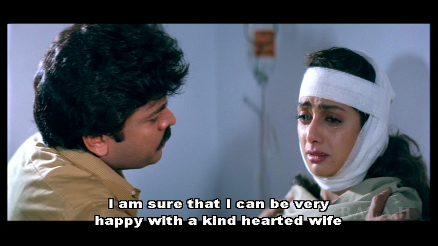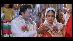 The romance and action intersect when the blue film gang kidnap Kumari who escapes and runs into the only man she can trust. She can identify the gang so there is a lot of interest in shutting her up. A murder attempt renders her blind and temporarily safe as a blind woman is not perceived as a threat. If only they knew as much as I do about incredible filmi medicine they wouldn’t be so sanguine! What with providing security and seeing her and her orphans, Chiru falls under Sri Devi’s spell and they marry. It’s a quick process, as she is still bandaged around her head on the wedding day.
