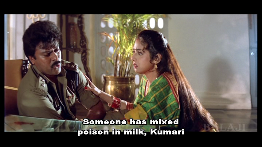 1. Thanks for blogging about all these old movies. It reminded of the days where I have seen some of these old movies you are blogging, including this one, in nearby theater where I lived once. This movie could not live up to expectation of people at that time even though it was remake of well ran Govinda’s hindi movie “Khuddar”. Sadly this was the last movie of Chiru and Sri combo (after a great hit of JVAS).