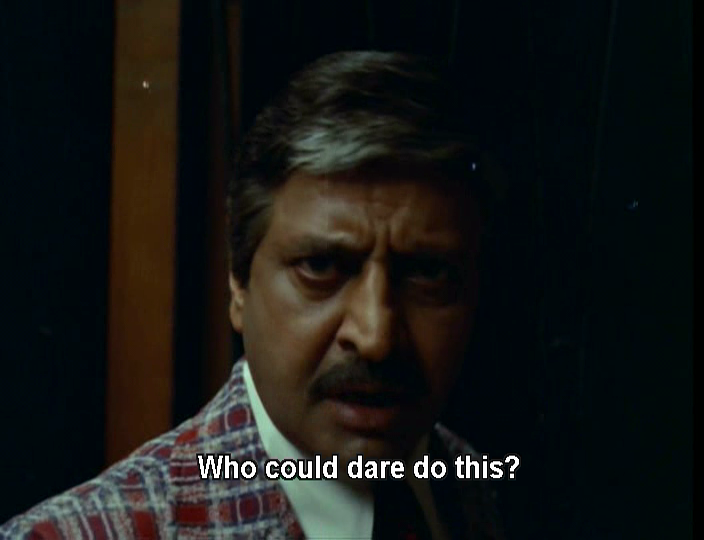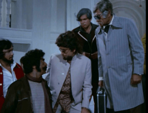 Iftekhar as the Police Commissioner looks like he turned up on the wrong set but was too polite to just leave so stayed on and did his bit. I liked Ashok Kumar as a paunchy middle aged hero – he was smart, capable and took to the wigs with great enthusiasm.  Shetty made a flamboyant purple suited appearance so it was clear Number 7 had opted for the very best class of henchman. Raza Murad played Shyam, Pran’s policeman son, and didn’t get much to do apart from being a lot taller than anyone in his family. Urmila Bhatt’s small role as Amarchand’s independent and dignified wife was quite pivotal, and only once in her scenes did I yell ‘nooooooooo’ at the DVD.