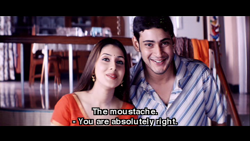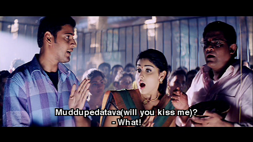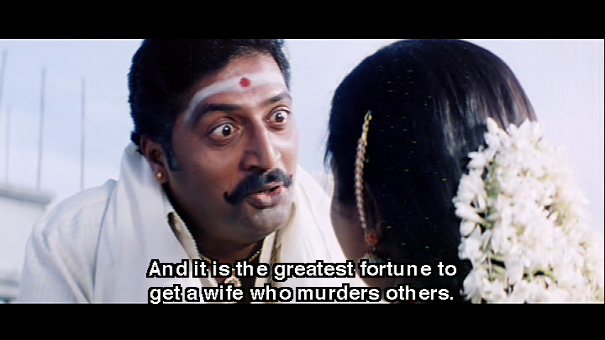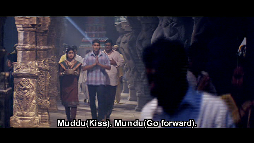 Of course, Rupa lives in Madurai with her domineering dad (Tanikella Bharani). Arjun’s pursuit of Rupa at first seems more about putting her in her place than any romantic attachment, but it is amusing. I am also grateful to the subtitle team who kindly explained the wordplay.