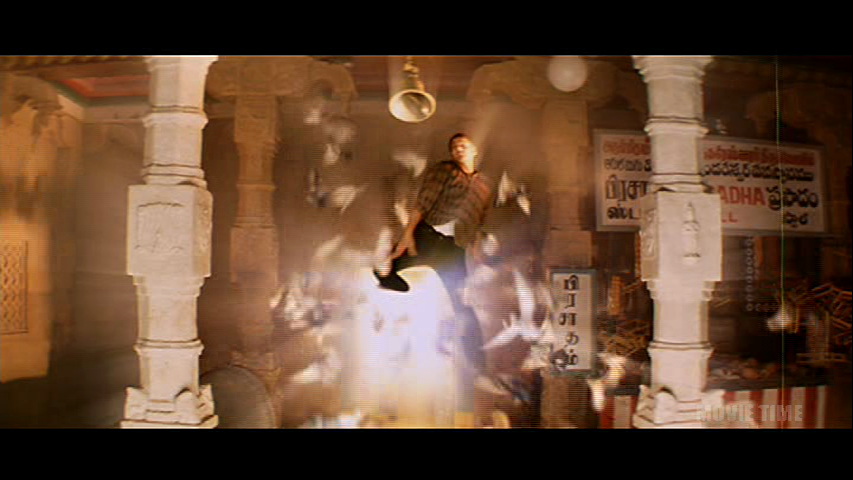 The Madurai set has stunning architecture and decorative flourishes and the crowds provide concealment, camouflage and distraction. The film combines the lush visuals of the temple set with opulent interiors, the intense jewel like colours of silk saris and excellent lighting. The camera work and edits are in keeping with the tone of each scene. The CGI, while a bit dodgy, was used for maximum impact. The soundtrack is OK but I remember the picturisations more than the music so I wouldn’t say Mani Sharma had done anything outstanding.