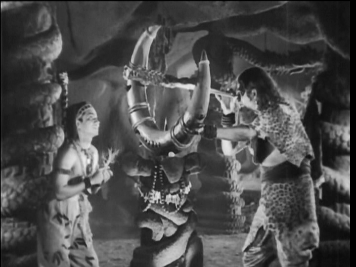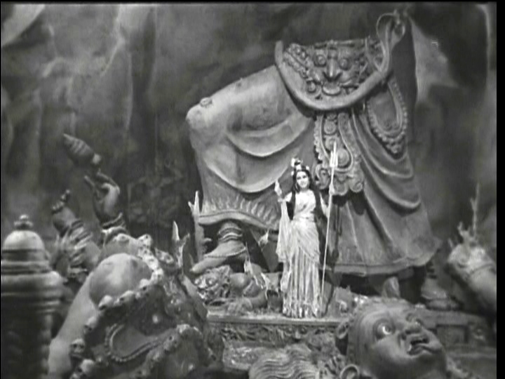 SV Ranga Rao is Nepala Mantrikudu, a sorcerer who needs to sacrifice an innocent young lad (I wonder who will fall into his hands) in order to gain control over an idol that can compel goddess Patala Bhairavi (Girija) to grant wishes. He has a fabulous cave lair with excellent statuary, and the hapless Dingiri as his assistant.