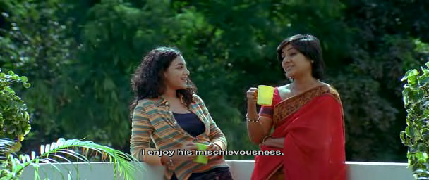I won’t go into parent-child relationships, but ‘spare the stick-spoil the child’ is so well-entrenched that again it reads as ‘humorous’ as his mom is asking him not be childish. (Nani says ‘Revathi – hey now this is really hurting – stop it’ and ‘Do you really need to do it at this age?’). Also, fathers physically controlling grown-up sons goes without comment (Chitram?, Happy Days?, Tholi Prema? Thammudu?). In this case, his mom had to take up the father’s role.