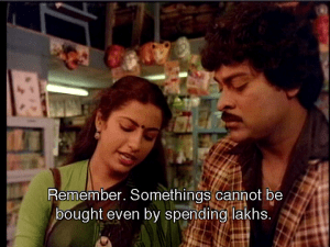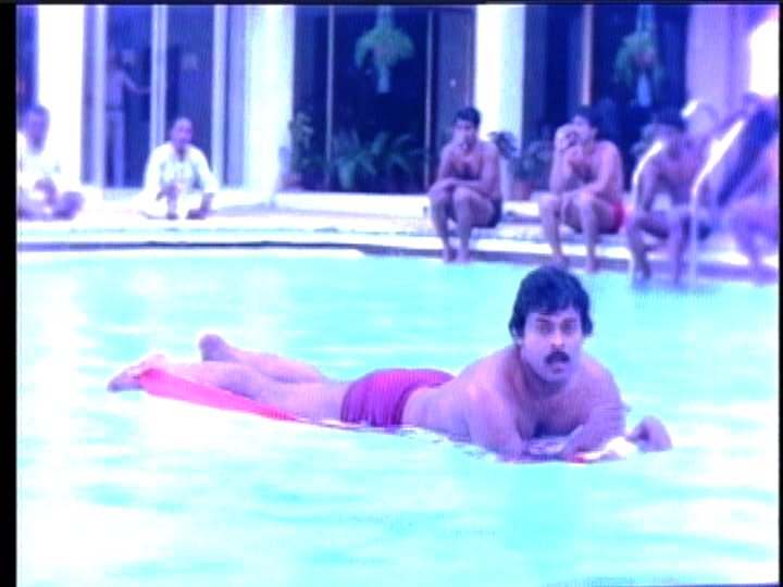 Charan goes off the rails due to the influence of vampy Hamsa (Silk Smitha). Only Chiru could make Charan watchable as he broods, rants and sooks over why his daddy doesn’t love him and then commits crimes as a cry for attention.  Showing that she is smarter than most people in the film, Swetha finds Charan’s hideout and dobs him in to the police. He kidnaps her in a dramatic getaway and their forced proximity accelerates the already budding love.