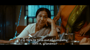 Sarah-Jane Dias is Sandhya, a tree hugging good girl who turns up to work in Jai’s nursery. Yes. Jai is a complex man and has diversified his investments into a plant nursery he runs with Chotu (Ali). Jai is drawn to Sandhya and she likes him. Their relationship starts with superficial attraction and develops through time and proximity. She has a bit more going on in her life than just waiting for Jai, but she is primarily the love interest. I liked their scenes more on the second viewing as the dialogues helped show her character as smarter than her prancing around in gumboots lead me to think (although I appreciated the work appropriate clothing). Just as things looked promising, Sandhya returns home suddenly to see her sick grandmother.