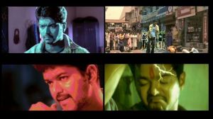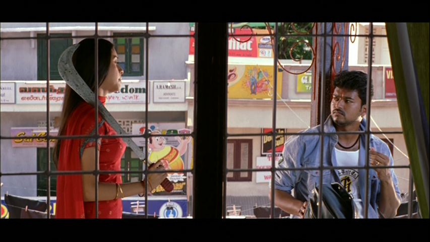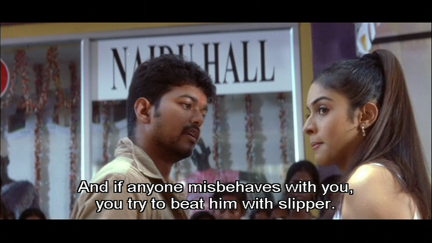 Vijay is the hero, Sivakasi. The police are largely useless against local thugs and he looks after the shop owners and residents of his area. His every gesture is underlined by a sound effect, he wears hideously embellished trousers and his eyes turn red whenever he is enraged.