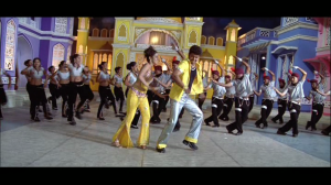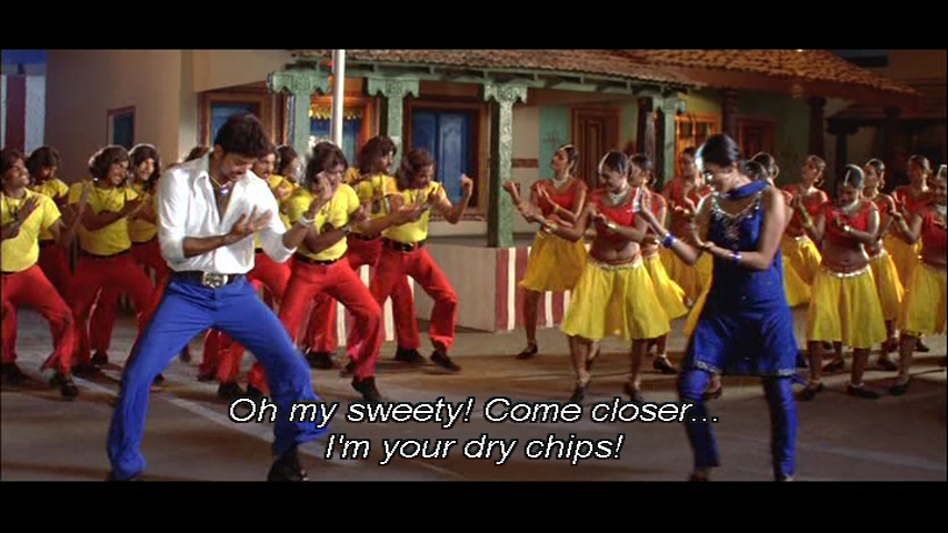 The songs (by Srikanth Deva) are what I expected – upbeat, loud, with colourful picturisations and flat-out dancing in exuberant mass filmi style. I must compliment the backing dancers, especially the guys. They are great fun and really enhance the dances with their facial expressions and uninhibited prancing. I particularly like this song, which is Muthappa’s romantic fantasy about Hema and again demonstrates his terrible taste in clothes.