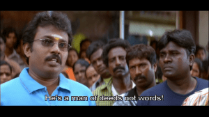 It becomes a bit tedious but there are some highlights. Prakash Raj is in good form as evil older brother Udayappa and sports a pleasing array of colourful shiny shirts. He is a local politician/industrialist/landlord/standover merchant. Some of Muthappa’s shenanigans work quite well. Having found a bunch of vintage film star impersonators to support his sister, Muthappa discovers Udayappa has one-upped him and hired Nayantara (as herself) for his rally. She ends up lured into a dance-off with Vijay, which is actually one of his more practical schemes.