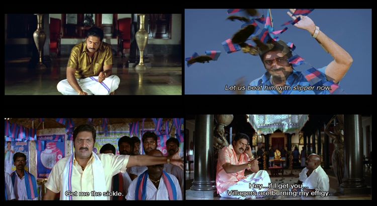There is a large support cast but they made little impression as the action is all about Sivakasi/Muthappa. No one really goes beyond the stereotype of crying Ma, suffering wife, comedy sidekick, bad guy, poor but honest villager etc, so they could have been played by anyone. Lakshana as Muthappa’s sister had the outline of an interesting character as the wronged woman turned politician, but true to the mass hero style everything was handled by her brother.