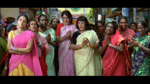 Sivakasi told Hema off for dressing skanky and western and said if she wore a sari men would treat her like the goddess Laxmi rather than trying to cop a feel. So when she arrives in a sari with a gang of sari-clad aunties and hijras, Hema calls his bluff.