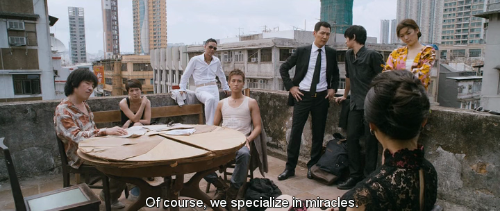 Choi Yeong Hwan makes great use of contrasts to set the mood with striking visuals and composition. The shady rooms and derelict factories where thieves do business are tucked away beneath the high gloss of Macau, with casinos doing the work of thieves in parting people from their money. You can almost taste the greed and aspiration. The action scenes are beautifully composed and edited, sometimes giving an aerial view of the moving parts ofa clever scheme and other times plunging into the action and confusion. In some scenes the film speed slows and speeds up to synch with the dramatic ebb and flow. Jang Yeong Gyoo’s soundtrack is perfect for this genre. Bouncy and brassy, sometimes even a bit funky, the music matches the pace and adrenalin of the action and visuals. It’s another very accomplished and confident effort from the team that made ‘Tazza: The High Rollers’.