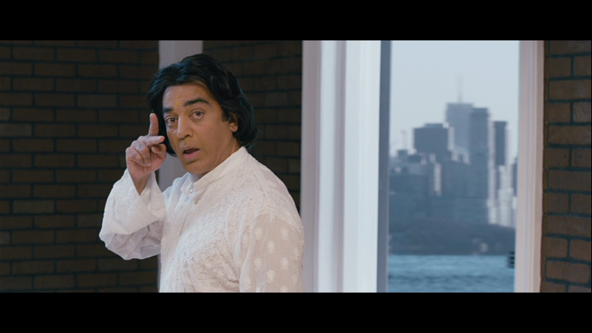 The film opens with Nirupama (Pooja Kumar) explaining how she has an arranged marriage with Vishwanath (Kamal Haasan), a middle aged classical dance teacher, which enabled her to come to America and obtain her PhD in nuclear oncology (this I couldn’t believe – 3 years and she’s finished already?!).  Despite her marriage, Nirupama is attracted to her boss, Deepak (Samrat Chakrabarti) so she hires a private detective to stalk her husband in the hope that the detective will uncover a reason for her to divorce.  Of course she does – this is New York after all.  Somehow in the process of chasing after this mild mannered dance teacher, the detective stumbles onto a terrorist cell, which leads to the terrorists tracking down Nirupama and her husband.