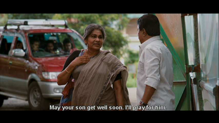 The second chapter tells the story of Sethu (Sreenivasan) and his bus trip to hospital to see his son.  On the way he meets an older woman, played by K.P.A.C. Lalitha, who is also on the way to visit her son, although her story is a little different.  This chapter is short and only seems to provide the background information to set up the last two, however the characters capture interest in their stories and it’s an improvement  after the slow beginning.   We never find out the older lady’s name or anything much else about her, but she is a reminder that there are many stories out there and we only see a small portion of each.  Although not much time is spent with Sethu there is a better sense of his life, his dreams and his problems, which makes his chapter more compelling.  Both Sreenivasan and K.P.A.C.Lalitha are excellent in their roles and as the camera concentrates on their faces while they chat on the bus, more is said by their facial expressions and demeanour than by their words. Maybe it’s a result of these roles being played by more seasoned actors but these characters have more rapport and more of a connection than the others in the story.