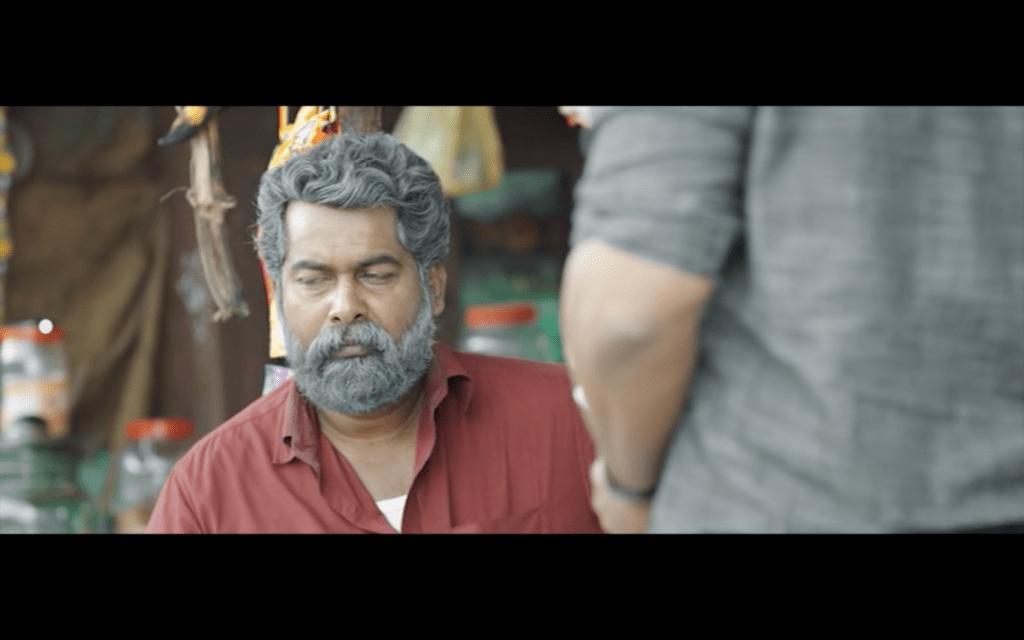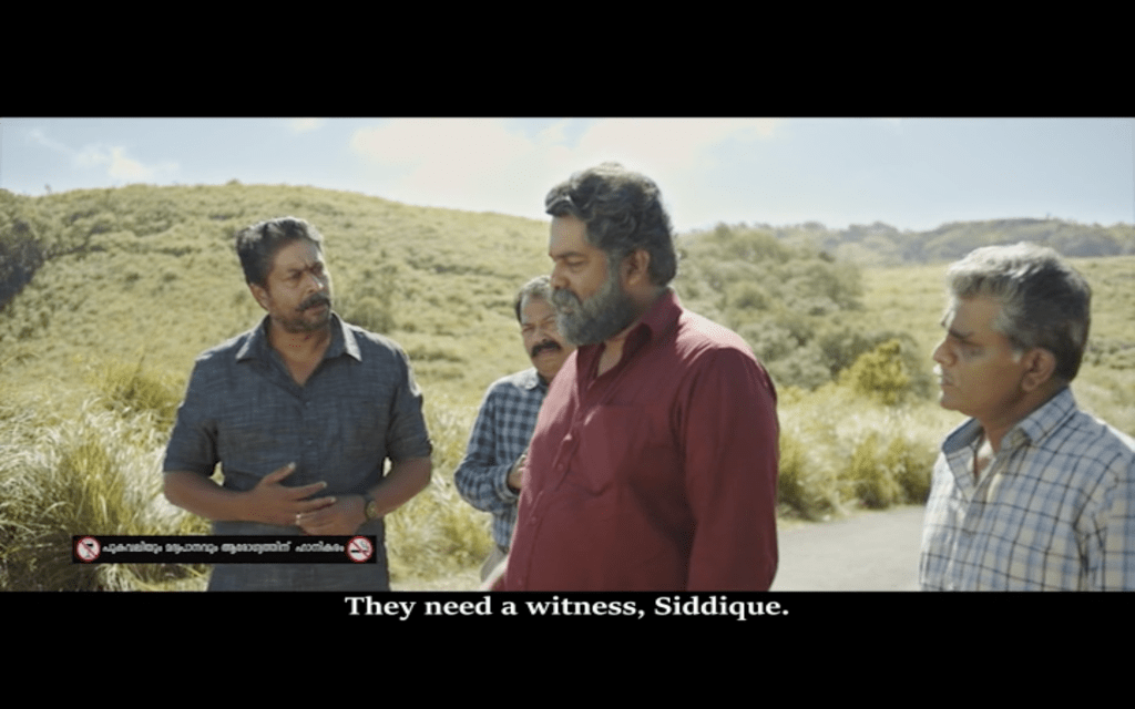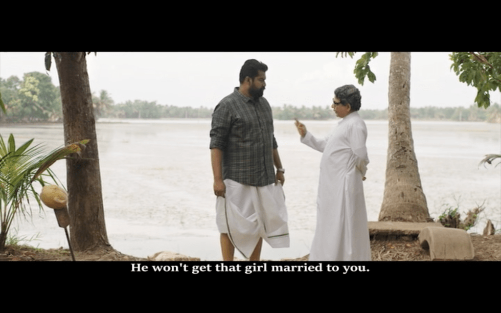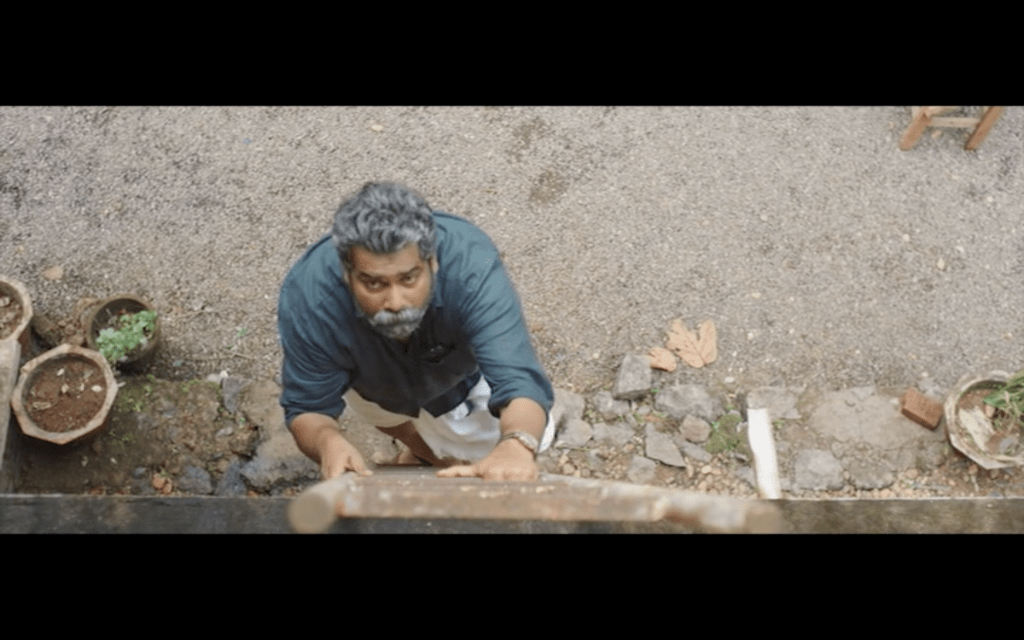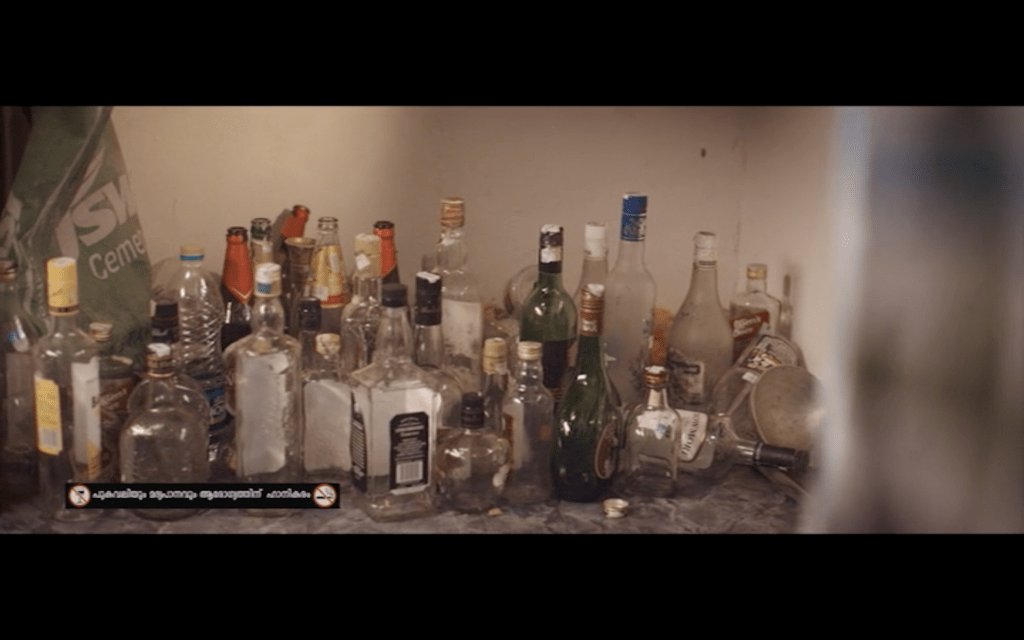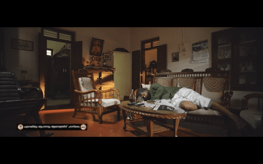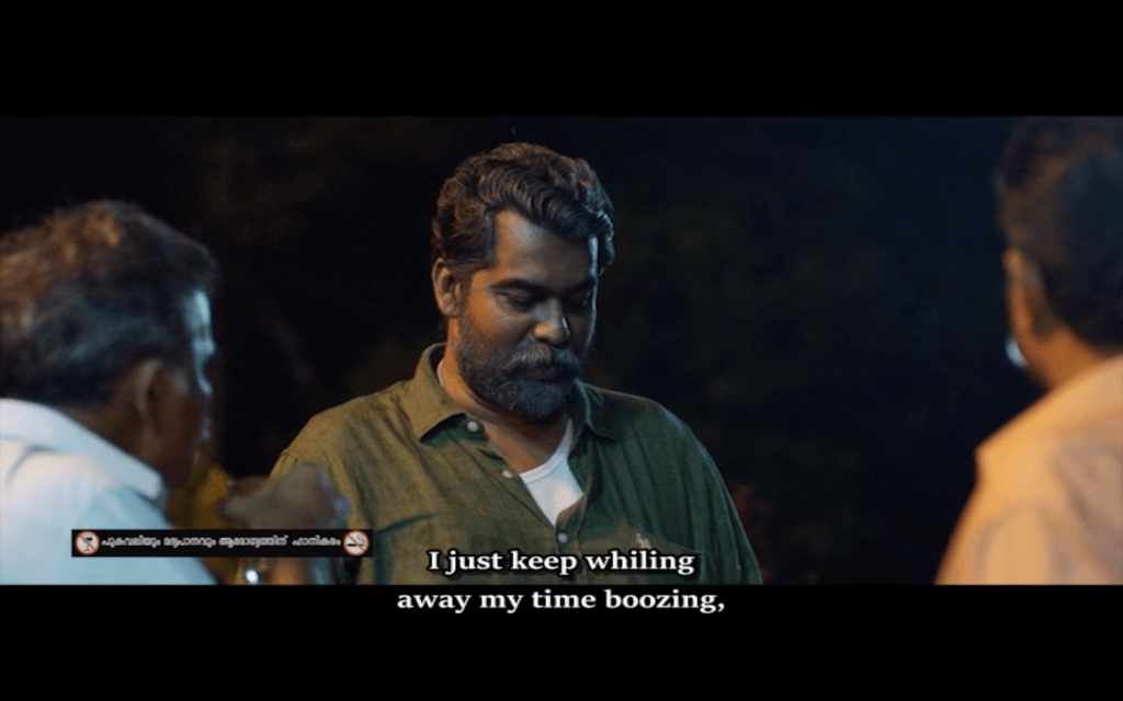 Having introduced Joseph as a solitary man who enjoys smoking, whiskey and marijuana, we then see a different side to Joseph on a day out with his friends (James Elia, Kijan), Sudhy (Sudhi Koppa) and Sidique (Irshad). I love the song they sing on their road trip, although the subtitles on the version I saw oddly substituted ‘rowers’ for ‘flowers’ which makes no sense to me at all. This is a more social side to Joseph and it’s clear to see why his friends respect him and enjoy his company, even if they don’t understand his wish to be alone in his house.