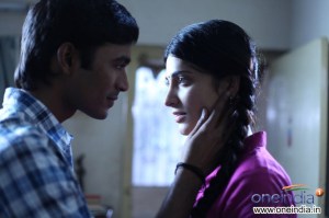 The love story progresses with the usual hurdles in the form of parents and familial expectation. Janani’s family are preparing to move to the USA and she has to deal with the prospect of leaving Ram just as she has realised her feelings for him. Shruti Haasan excels here as the young girl infatuated with her lover but struggling to conform to her family’s wishes and she finally makes a decision in spectacular style. The young actor playing her sister is also very impressive and overall the romance is beautifully developed. Shruti and Dhanush have great chemistry together onscreen and their relationship progresses very naturally. The interactions between Ram and his father (Prabhu) were also very genuine and well written with plenty of humour and a real sense of the sincere relationship between father and son.