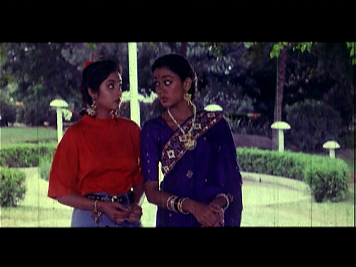 Rani is not my favourite filmi heroine but I do think Divya Bharti did quite well with what is often a shrill, silly character. Rani did rise to the occasion when she had to, although I was dismayed when I found myself almost cheering her suicide attempt as at least she did SOMETHING for herself that didn’t just involve shrieking “do you know who I am?” (She had some help from an enthusiastic red paint wielding assistant.) Her outfits were what I have come to expect from 90s Telugu films. But seriously ladies, when your mum asked what teenaged you and your boyfriend/self-declared husband got up to last night would any of you answer like this?