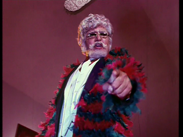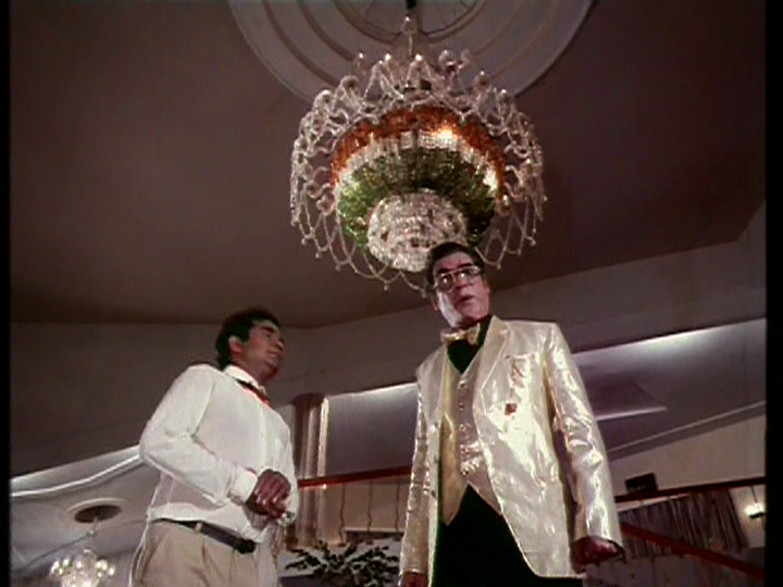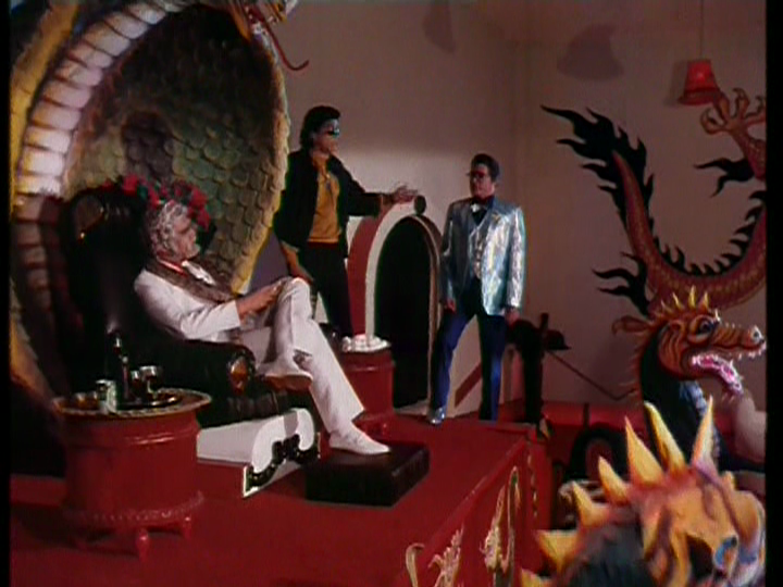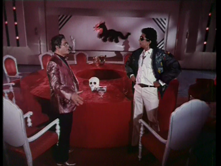 Amrish Puri as an evil mystic with an excellent lair. The symbolism is quite eclectic. The beak on that peacock drawbridge must have been heavily reinforced as it hits the ground with a satisfying thunk. The lair is one of those that can only be reached by water, a long arduous trek or ride, or maybe a brisk walk from the office. There are some geographical inconsistencies that put me in mind of Howl’s Moving Castle. Gadra also has a crocodile pit AND cage full of bloodthirsty cheetahs, and still finds time for his day job.