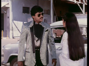 Sharada as a vengeful woman with exacting standards in machete purchasing. I love Sharada’s intensity and she has an elegance that shines through. Like Chiru, she can inject a bit of quality into the drama and shenanigans in even the silliest script. Sambhavi is strong, resourceful and driven by a thirst for revenge. She has an iron will that even Gadra cannot overcome and she does an excellent ‘death stare’ that is almost on par with Amrish Puri.