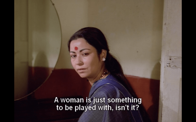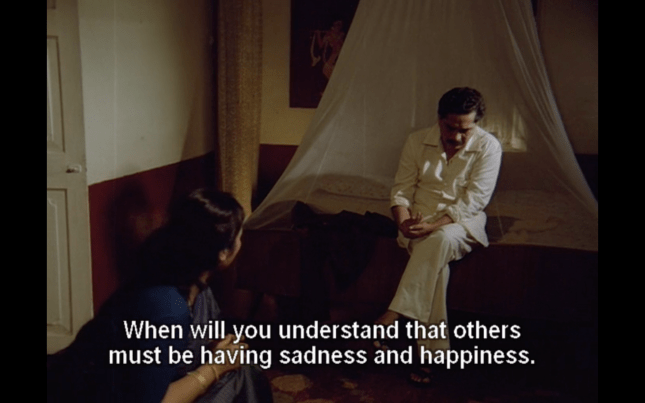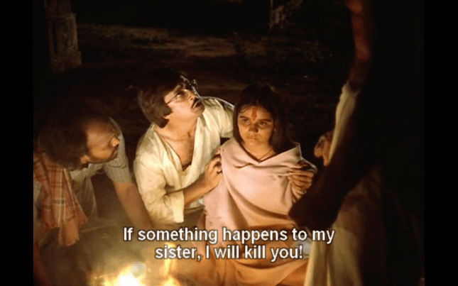 One of these revelations is that Chennabassapa seduced Basava’s wife who then suicided by jumping into a well. Saroja takes Chennabassapa to task, telling him that like all men his sexual conquest meant nothing to him but was a major event for the woman that resulted in a death. It’s a small part of the plot, but it makes a big impact as, in a few words, Saroja rips apart her husband’s complacency and points out the inherent hypocrisy of their society. I wish the film had gone further into this and perhaps even brought it into the climax, but it’s still an excellent piece of writing and kudos to scriptwriters Vijay Tendulkar, Vikas Desai and Aruna Raje for including such a frank conversation in the film.