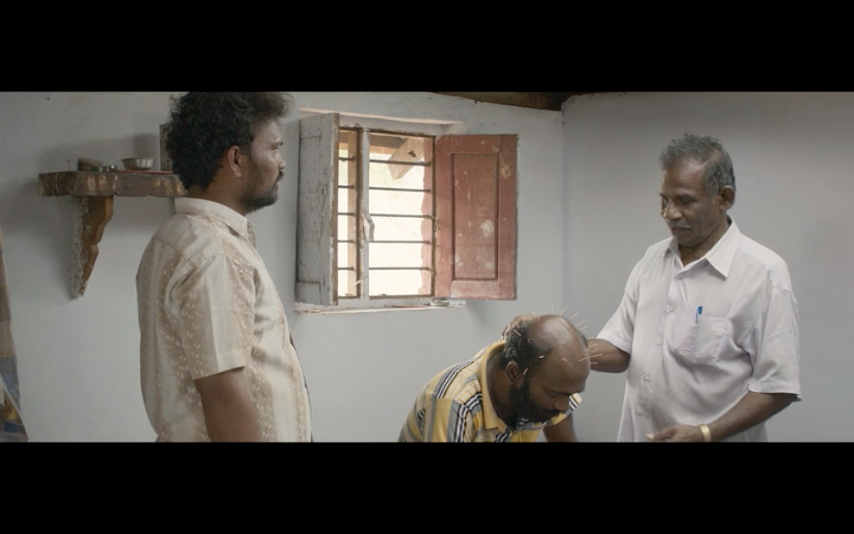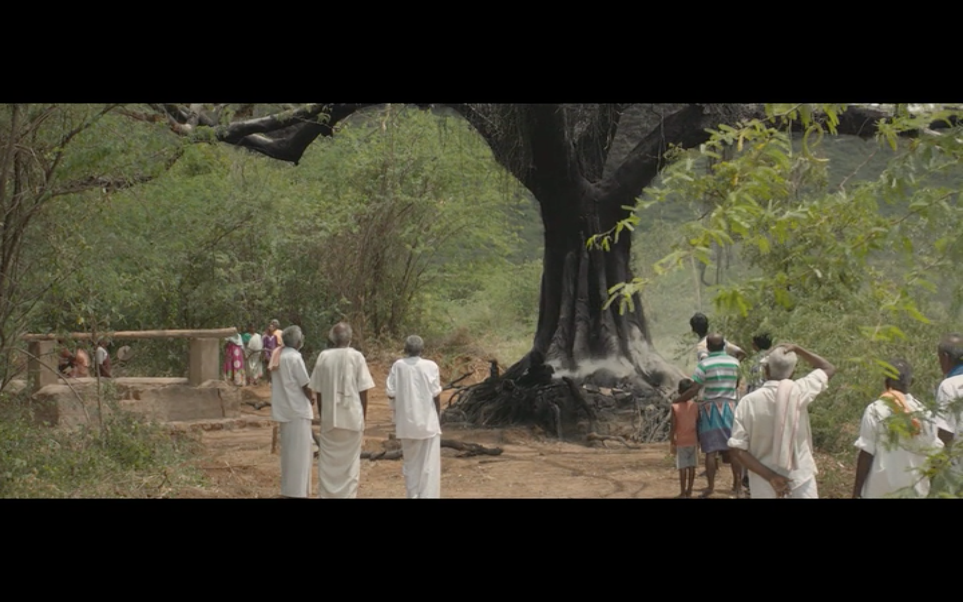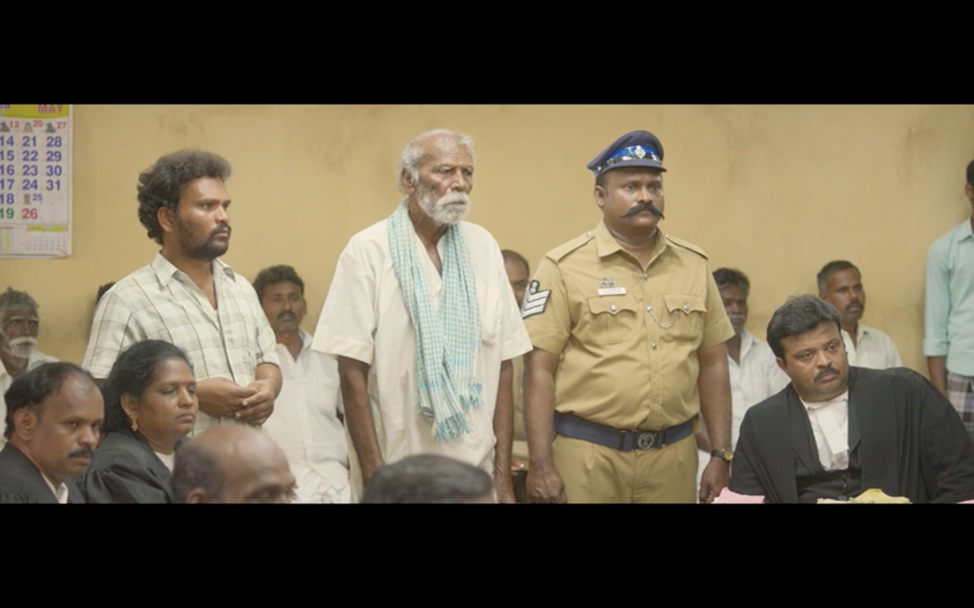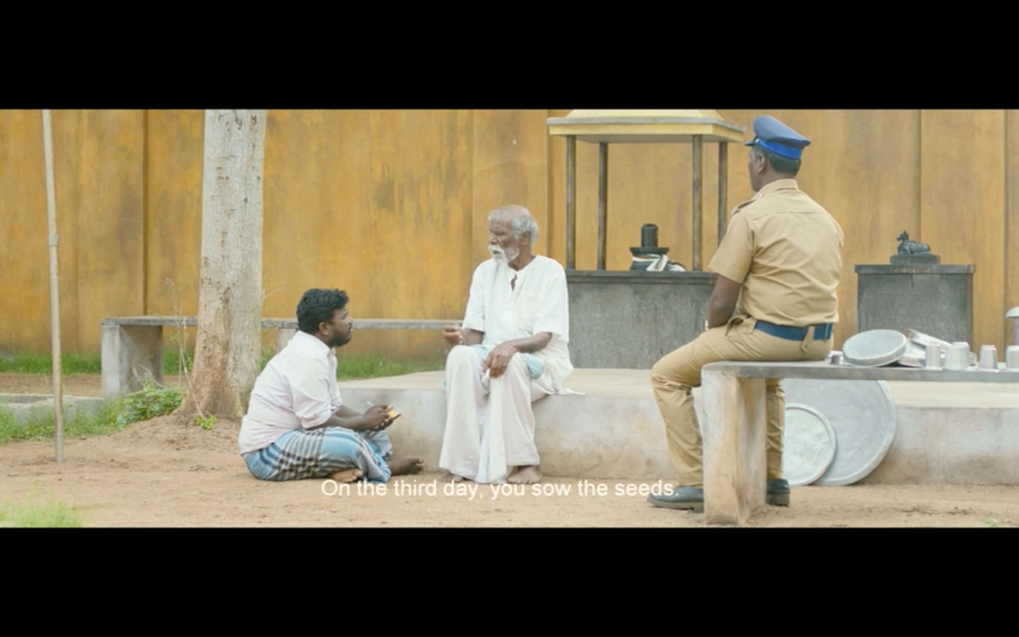 In addition to being old and illiterate, Mayandi is also hearing impaired, so when he is arrested for a crime he clearly didn’t commit, he doesn’t understand what is happening or why he cannot go back to his farm. The farcical nature of the court proceedings is kept grounded by the sympathetic but punctilious judge (Raichai Rabecca Philip) who would like to release Mayandi but is bound by strict rules and has to follow procedure. One story arc follows the police officer who is tasked with looking after Mayandi’s crop and how that allows him to become a more sympathetic character. While in jail, Mayandi also shows one of the other inmates how to grow a plant from seed but despite this brief respite, Mayandi is still lost without his usual day to day routine. Poignantly he can only see the tops of the trees from his cell and is reduced to looking at the sky, waiting to be able to go back to his fields.