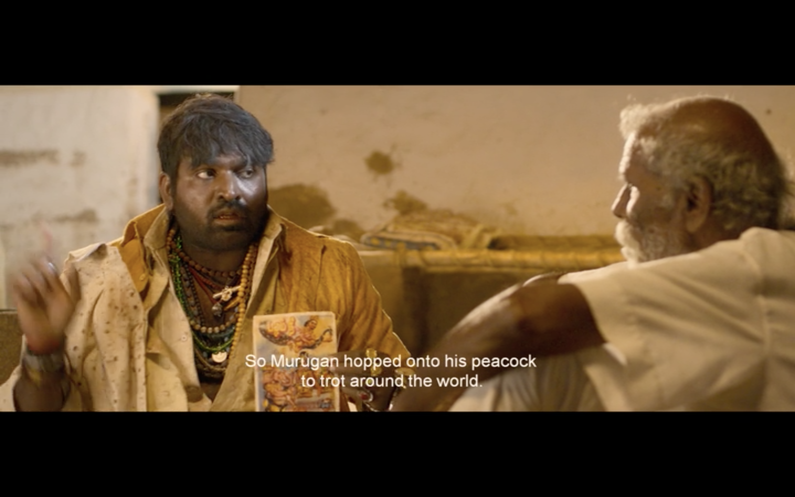 A side plot involves Mayandi’s son Ramaiah (Vijay Sethupathi) who is said to be mentally disturbed following the death of his girlfriend. He is a follower of Murugan and wanders the area with all his possessions in two jute bags. Ramaiah wears numerous broken watches on his arm and appears and disappears randomly, seemingly unaffected by time and the burdens of everyday living. He is a spiritual figure who stops to tell his father about Murugan and it is hinted throughout the film that he is actually the most sane character despite his mental illness. Vijay Sethupathi is excellent and his portrayal here is the main reason why the character works within the film. He conveys an other-worldly quality to Ramaiah and his relationship with the natural world creates a bond with Mayandi who also has a great respect and belief in Nature.