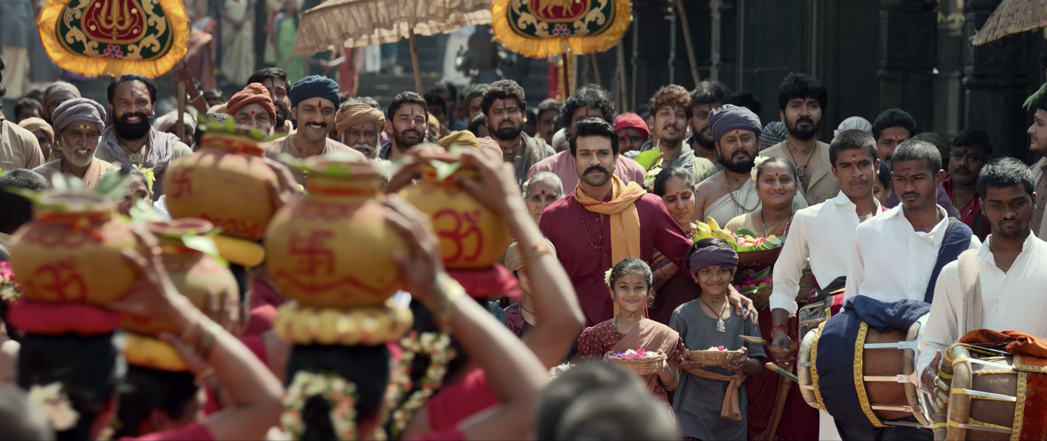 Against the heightening tension between the temple and Basava’s thugs, a stranger arrives in town and sets up a carpenter business in Dharmasthali. Acharya (Chiranjeevi) at first seems to be a do-gooder who sets out to help the people affected by Basava’s greed, but it becomes clear that there is a deeper reason for his involvement. The second half reveals the story of Siddha (Ram Charan) and why Acharya is working to save the people of Padaghattam and Dharmasthali.