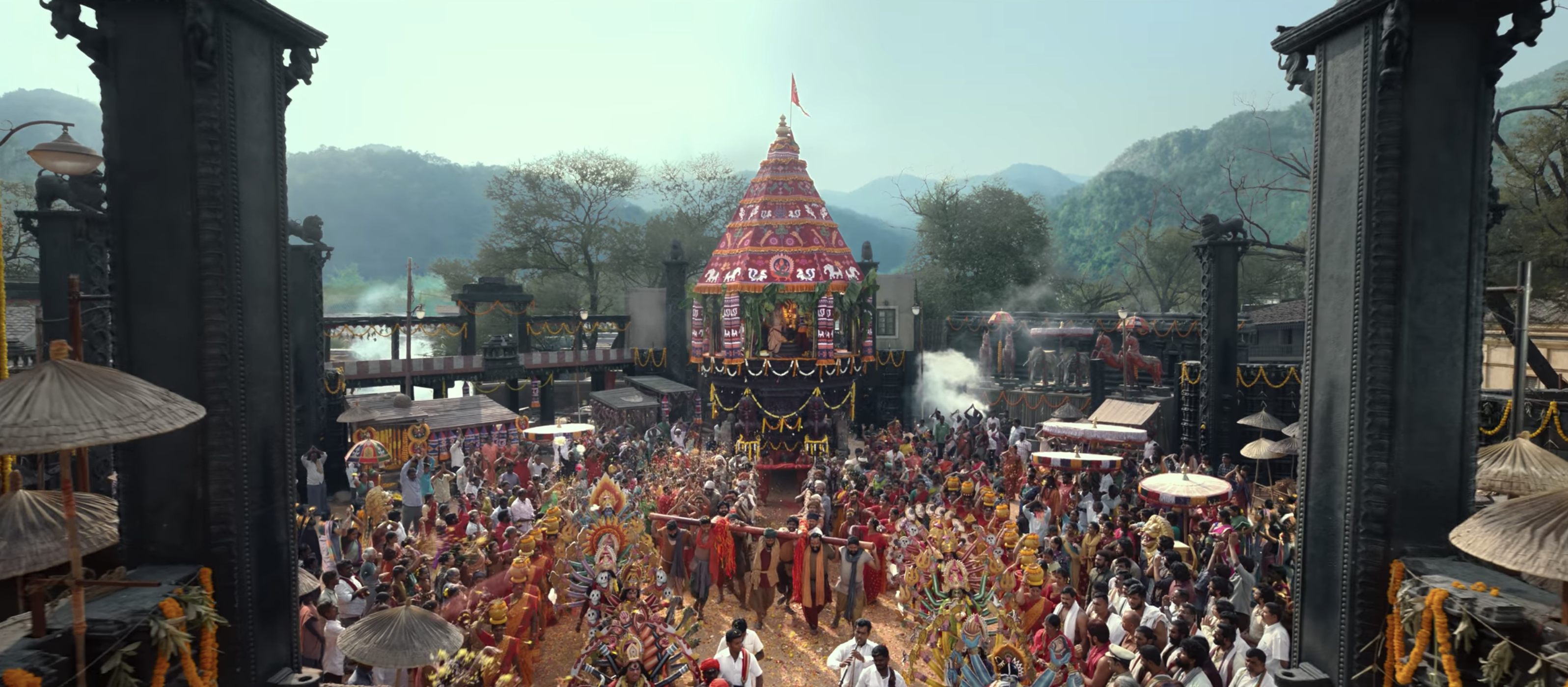 The film opens with a fairly long animated sequence explaining the history behind the twin villages of Dharmasthali and Padaghattam. At least I think that was what was happening, because the subtitles were difficult to follow and mostly didn’t make sense. But from what I could gather, the village of Dharmasthali developed after the goddess Gattamma came to Earth to defend the tribal people of Padaghattam. The villagers built a temple in her honour and continued to live a peaceful existence until the people of Dharmasthali became corrupted. In contrast the tribal village of Padaghattam still followed the traditional way of life, and still do today, producing ayurvedic medicines that they take across the river to Dharmasthali. However life is becoming more difficult for them as Dharmasthali becomes a hotbed of crime and violence and the goddess seems to be allowing her people to be attacked.