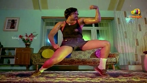 Now can anyone tell me, was 1981 a big year for the zipper in Indian fashion? Madhavi is abducted by one of the baddies and he gleefully has at her multi-zippered playsuit. Chiru sports a very peculiar onesie with feature zippers that is not exactly flattering to the stockier gentleman.