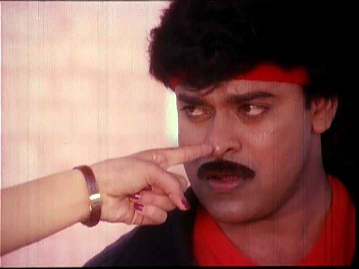 A man throws a banana towards a blind woman begging, and she accidentally knocks it away. A young Brahmin boy watches her struggle to find the fruit, but does nothing as he cannot touch her or the food that she has touched. He is troubled by her situation, but doesn’t act. Eventually someone does come to her aid, and he also gives the boy a lecture on the futility of mouthing a mantra if you do not act in accordance with the values contained in the prayers. This incident infuses the story, told in an extended flashback as Suryam (Chiranjeevi) shows a visiting minister around the apparently perfect village.