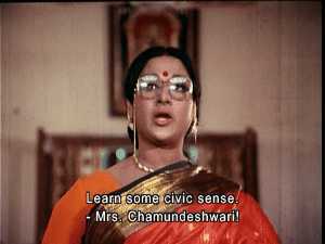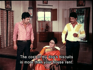 Music in the Sastry home is ceremonial, devotional and not for fun or for the people. The father is very traditional and conservative, living in strict adherence to caste rules. Bilahari Sastry raises his voice in song to drown out the pleas of someone needing help, and would rather be on time for a concert than help a dying commoner. And he pulls this face a lot: