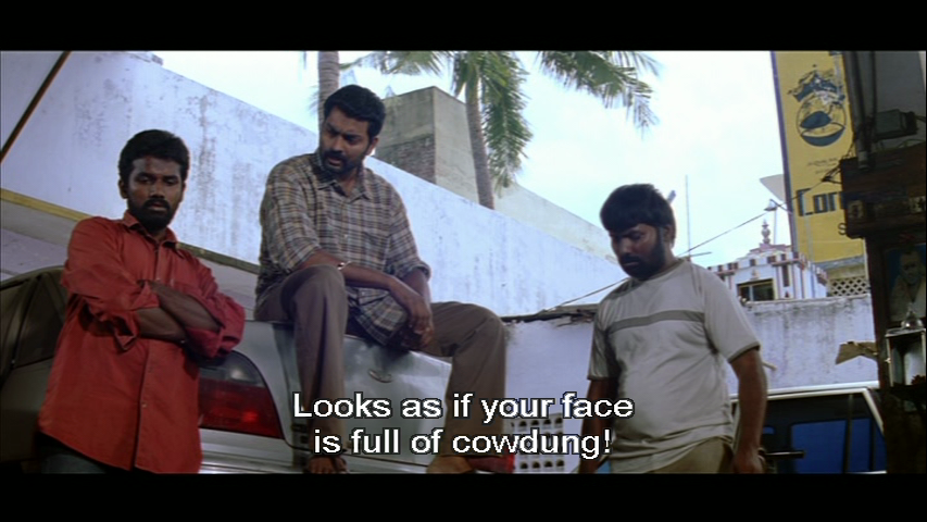 The action sequences here by Anbariv are excellent and Girish Gangadharan captures the effects beautifully. The scale of the film is huge with wide shots over the city of Chenni, massive gunfire and explosion sequences and then a total change to close-ups of Sandhanam’s gold teeth. Girish ensures it all looks stunning regardless. Even at 3 hours of runtime, nothing in the film drags and with Anirudh’s soundtrack underpinning the action and emotions of the film, the balance is perfect. Thanks to rekhs who has subtitled the entire film with perfect English although the use of ‘shucks’ and ‘crap’ as substitutes for the actual dialogue did make me smile. I’m assuming there is a censorship reason behind the change since the original words are clearly audible. Thanks too for the yellow font which is much more readable than white.