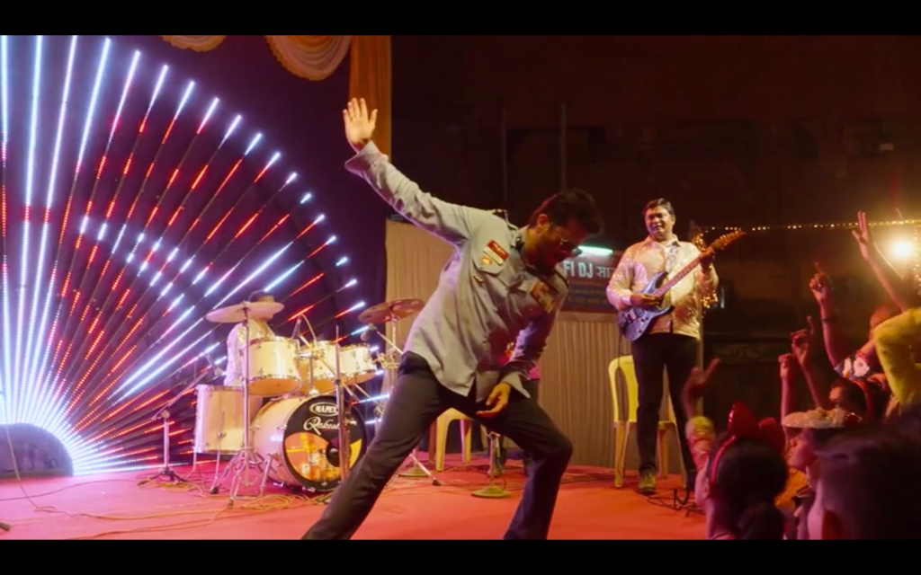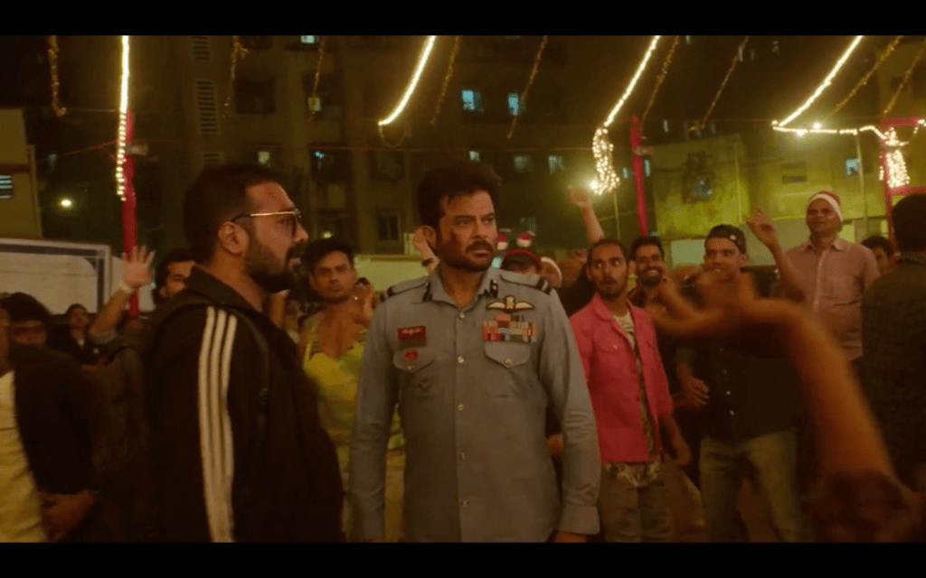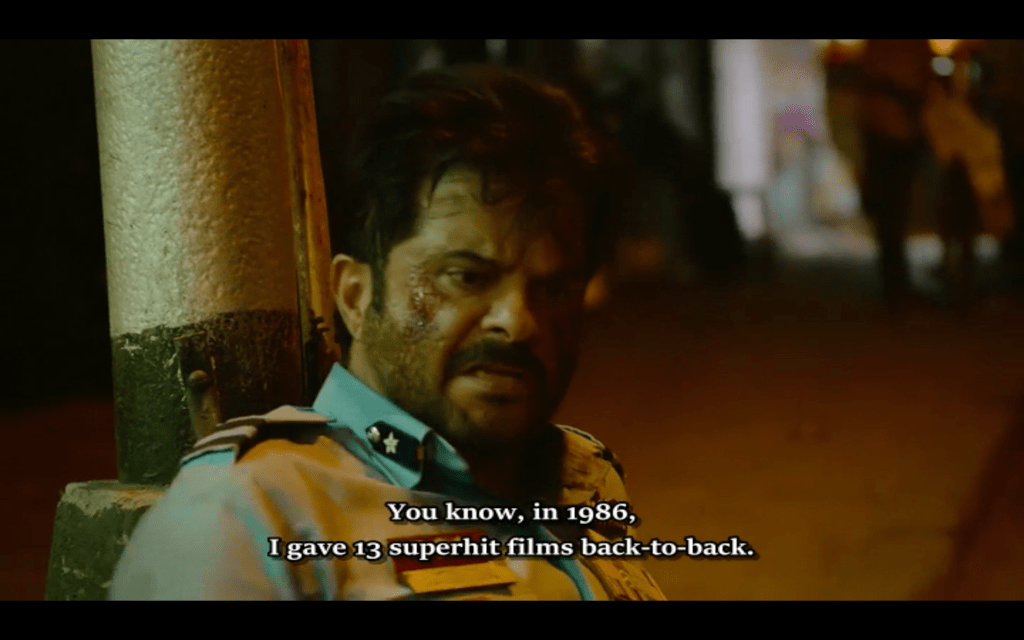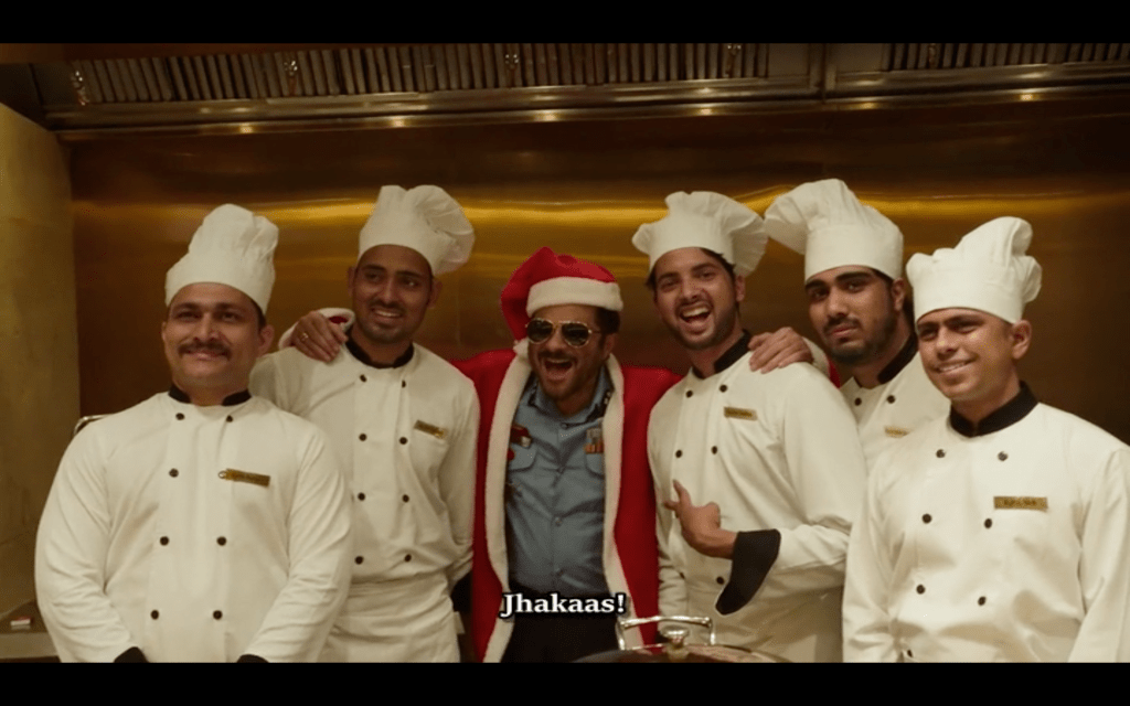 As part of the chase, Anil ends up at a Christmas party where the revellers won’t help him until he performs for them in a brilliant ad hoc dance performance. What makes it even better is Anurag clapping and cheering at the very edge of the crowd. Despite all his digs about Anil’s slide into obscurity, he seems happy to be watching the crowd’s reaction to their hero, or, is he just enjoying the delay to Anil’s hunt for his daughter? The manic look on Anurag’s face tends to suggest it’s much more likely to be the latter. There is ambiguity everywhere, a few unexpected twists and plenty of self-aware backslapping which somehow all works better than it should.