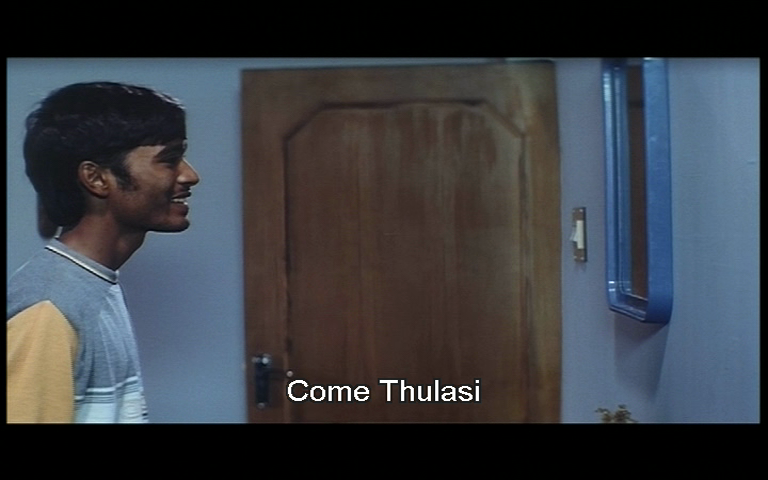Srinivasan (Dhanush), nicknamed Cheenu, is the only child of middle class parents and spends his days lazing around with his friends after finishing his degree. He is lazy, spoilt and petulant seemingly as a result of his mother’s indulgence. His father Ganeshan (Delhi Ganesh) is a strict disciplinarian with a tendency to violent outbursts as he berates Cheenu for his apathy and lack of enthusiasm with job hunting. Cheenu insists that he is nothing like his father and is obviously afraid of him, but as we see when he is out with his friends, he has exactly the same violent temper and tendency to strike out when he is angry. Cheenu’s mother is sidelined throughout the film and rarely gets a chance to speak. Mostly she is helpless and unwilling to intervene between father and son.