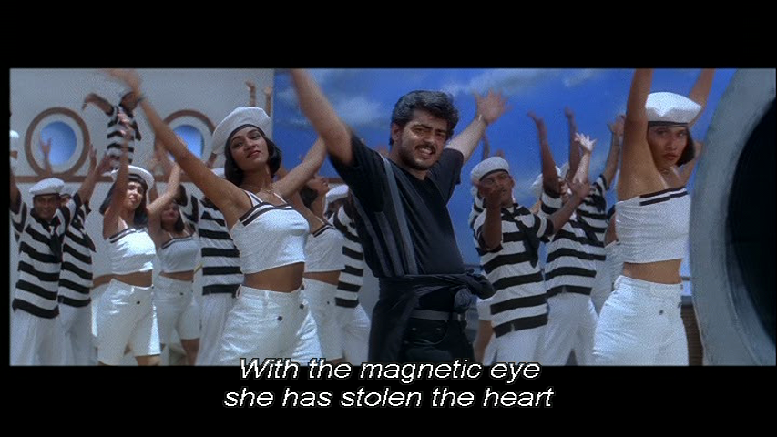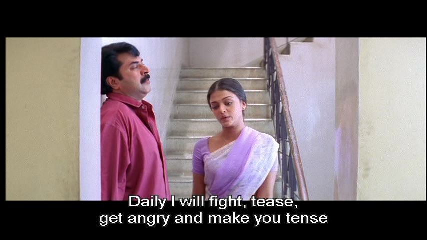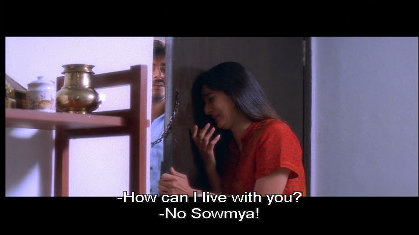 The story starts with Shekhar (Arvind Swami) returning home to visit his family in a river-side village in Tamil Nadu. Just as Shekhar arrives he sees Shaila Banu (Manisha Koirala) and instantly he falls in love. Luckily the attraction is mutual and despite their different religions, a romance begins to grow between the two. Shekhar has been studying journalism in Bombay, which gives him a city sophistication and an intolerance for his father’s prejudiced views. Narayanan Pillai (Nassar) is a devout Hindu whose worst fear seems to be that his son will marry a bride from the North of India, since he is unable to imagine the horror of a daughter-in-law from a different religion. Shaila’s family is just as appalled by the thought of Shekhar and her father Basheer (Kitty) quickly arranges a marriage for his wayward daughter when he finds out about the affair. The clandestine nature of the romance allows for some beautiful camera work from Rajiv Menon and we also get the beautiful Kannalanae as Shaila spots Shekhar at a wedding.