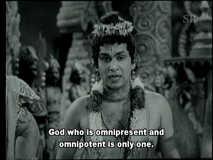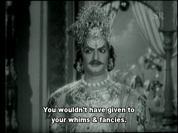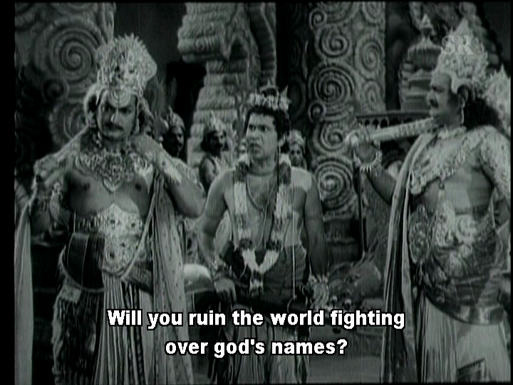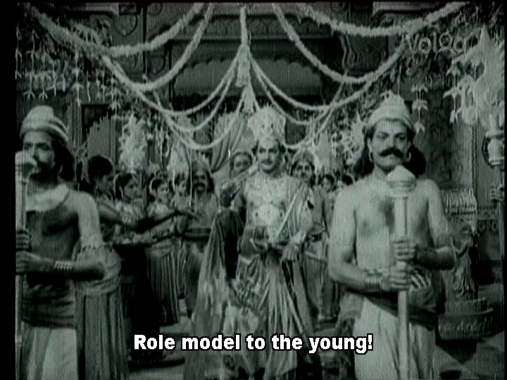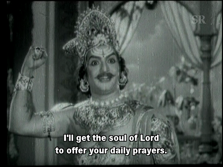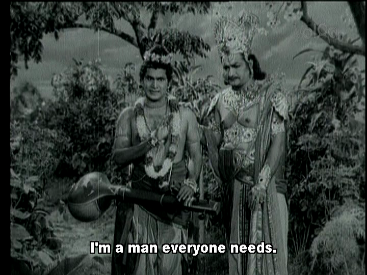 The animosity between would-be in-laws Ravana and Mayasura (an ebullient S.V Ranga Rao) is due to their worship of different gods – Shiva and Vishnu. There are some very pointed references to this, including Narada rebuking them for not realising that god is one and omnipotent. I wondered if this speech was in response to current day issues or purely part of the story. It seemed to be directed straight down the barrel of the camera which made me think it was at least partly commentary aimed at the audience.
