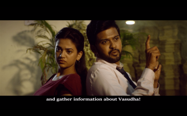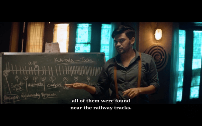 Agent’s actual detective work consists of small cases and barging in unwanted on police investigations, which earns him the ire of the local officers and ends up with him being forcefully ejected from crime scenes. However, when his friend Sirish (Chanakya Tejas) tells him about unidentified bodies being found alongside railway tracks, Agent has a whiff of a case that he can really sink his teeth into. The only problem being that the police arrest him on suspicion of the murder when they find him at the site of a recently discovered body. During his night in jail, Agent speaks to an old man, Maruthi Rao, who tells him about his daughter who was raped and murdered. The police aren’t showing any interest in the case and Agent vows to find Vasudha’s killer. Agent assigns Sneha to follow the more dangerous looking of two suspects, while he himself shadows Ajay (Sandeep Raj) but when both Harsha (Vinu Varma) and Ajay turn up murdered, Agent is once again prime suspect for the police. Along with a fellow private detective Bobby (Suhas), Agent slowly starts to unravel the case, which ties into the railway bodies mystery and even has connections to his own personal life. With the police determined to blame Agent for the murders, it’s a race against time to fit all the pieces of the puzzle together and solve the crime.