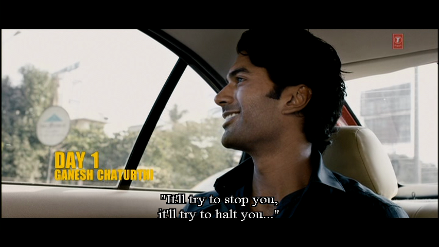 I liked the contrasts in Abhay’s story. Firstly the contrast  between his work life; trying to set up a business, dealing with IT issues, dealing with his employees and the extortionists and then his more Western style life clubbing and shopping with his girlfriend. Again the story is very realistic and there is a moment where Sharmili spots a poster of herself and her reaction of – look there’s me! – is spot on. Then the contrasts between the noise of Ganesh Visarjan and the quiet of Abhay’s apartment, and of his initial excitement at being in Mumbai gradually changing as the realities of his situation kick in. But what really impressed me here was a scene where Abhay’s employee speaks to his wife on the phone about eating dinner with his boss just before Hemraj walks in. The detail about his phone conversation makes his employee a very real person and the distain with which he is subsequently treated serves to accentuate the viciousness of the extortionists. This attention to small details occurs throughout the film and I think this is why it feels true to life and works on a number of different levels.