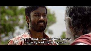 I first saw Aadukalam when it released in the cinema and despite the lack of subtitles was so completely drawn into the story that I didn’t want the film to end. I was very surprised that I enjoyed it so much since the film centres around cockfighting, which is something I abhor and wasn’t keen to watch on-screen. It was really only the Vetrimaran and Dhanush connection that got me through the door, but I’m so glad that it did. While the film didn’t change my views on the subject it was a lot more watchable than I anticipated, helped considerably by this statement in the opening credits and the fact that the cockfighting scenes were quite clearly CGI.