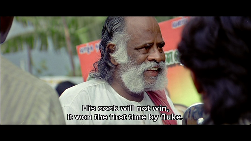 The first half of the film deals with Rathinasamy’s attempts to force Pettaikaran to take part in a cockfighting tournament so that he can finally win over his main opponent. Pettaikaran however knows that Rathinasamy will stop at nothing to win and refuses to take part in any further matches despite major provocation. However Rathinasamy is as corrupt as he is determined and he finally manages to set up the final showdown. The stakes are high – apart from all the money to be won, the loser will have to shave his head and moustache and, almost as a secondary consideration, they will also have to give up cockfighting for good.