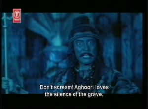 My DVD has the worst picture quality but the most marvellous subtitles. Aghoori is hunting a nagin couple, Pritam and Banu, who unlock a treasure trove every lunar eclipse using amazing special effects.
